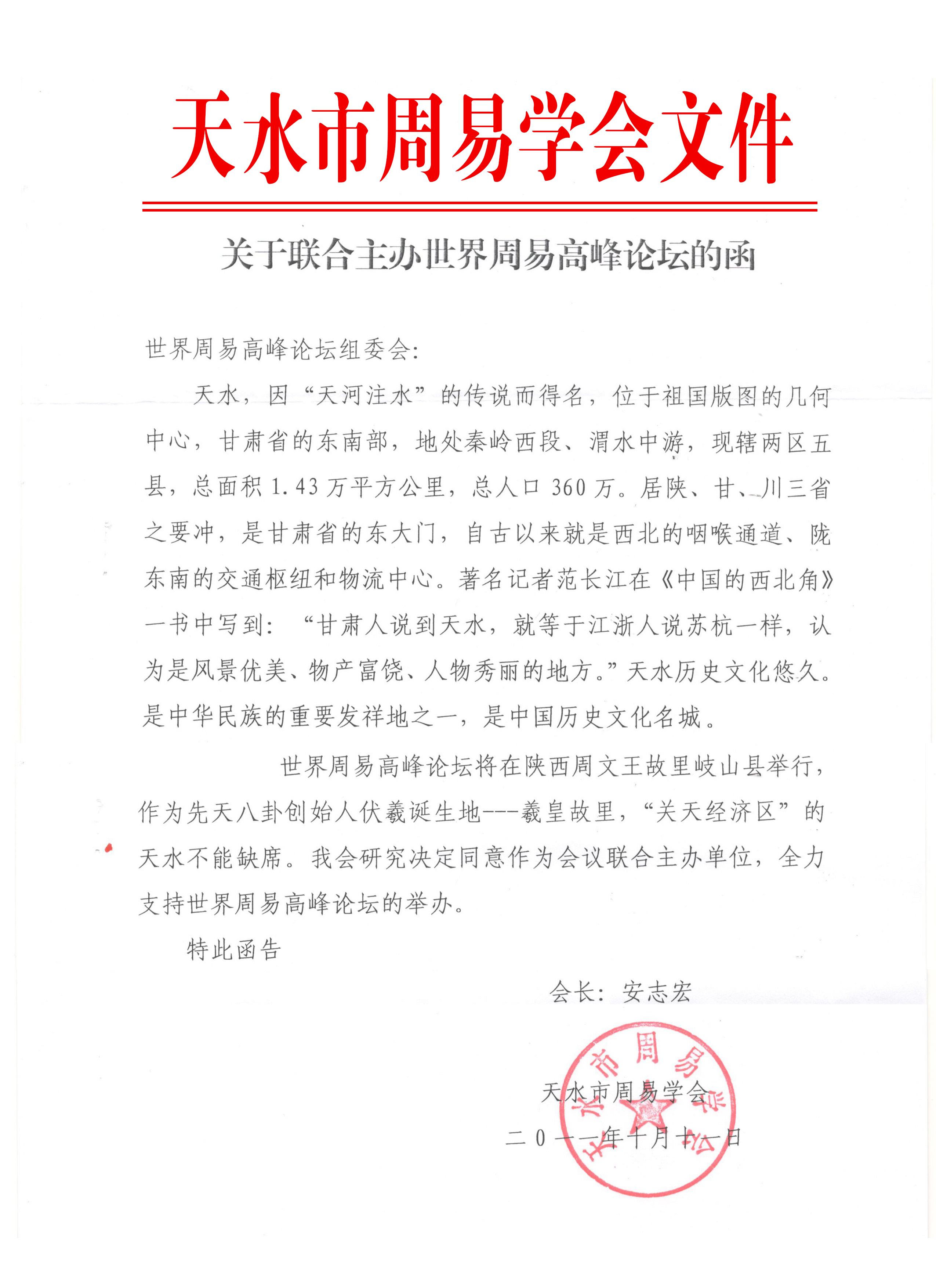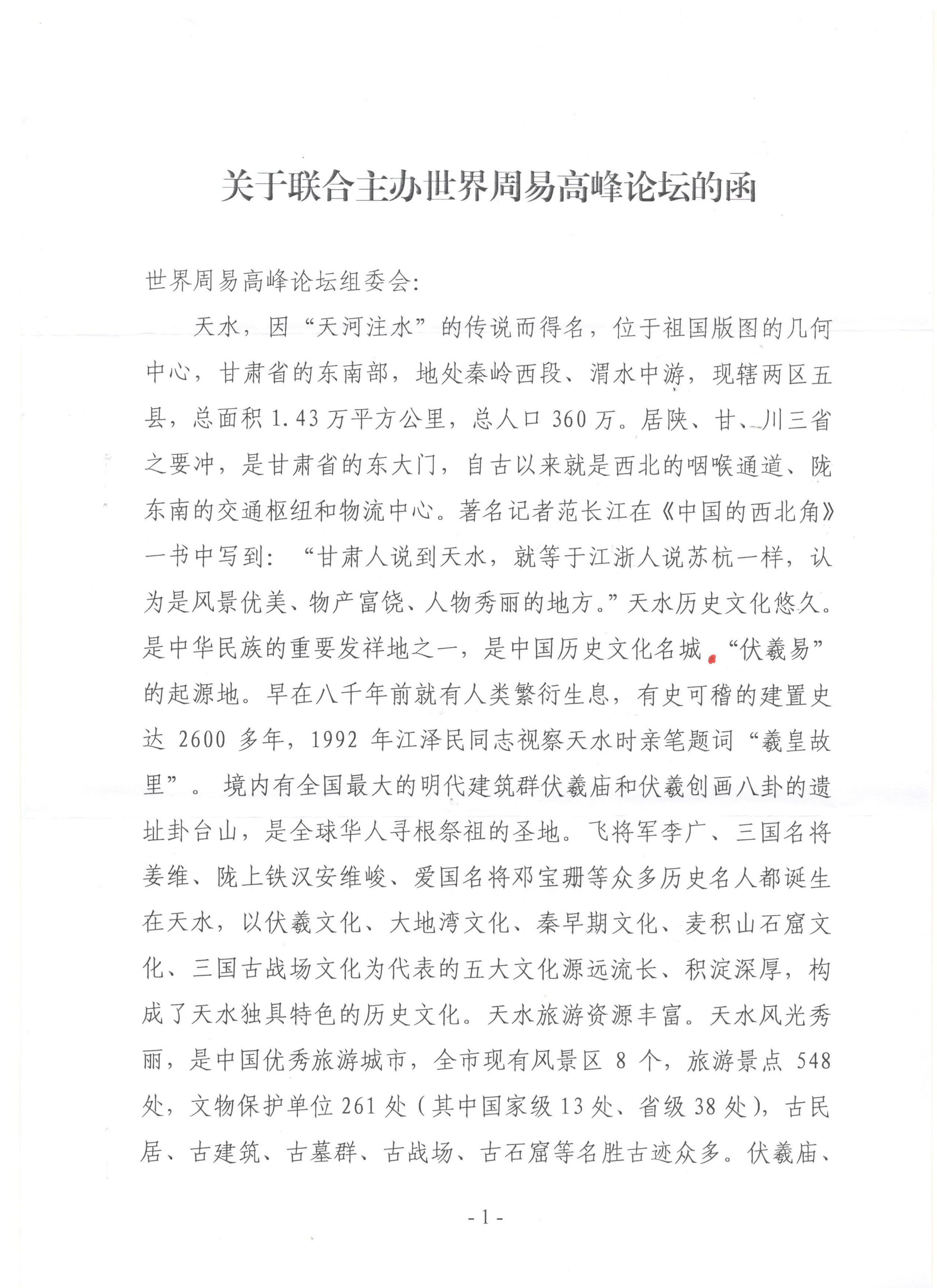 天水市周易学会关于联合主办世界周易高峰论坛的函