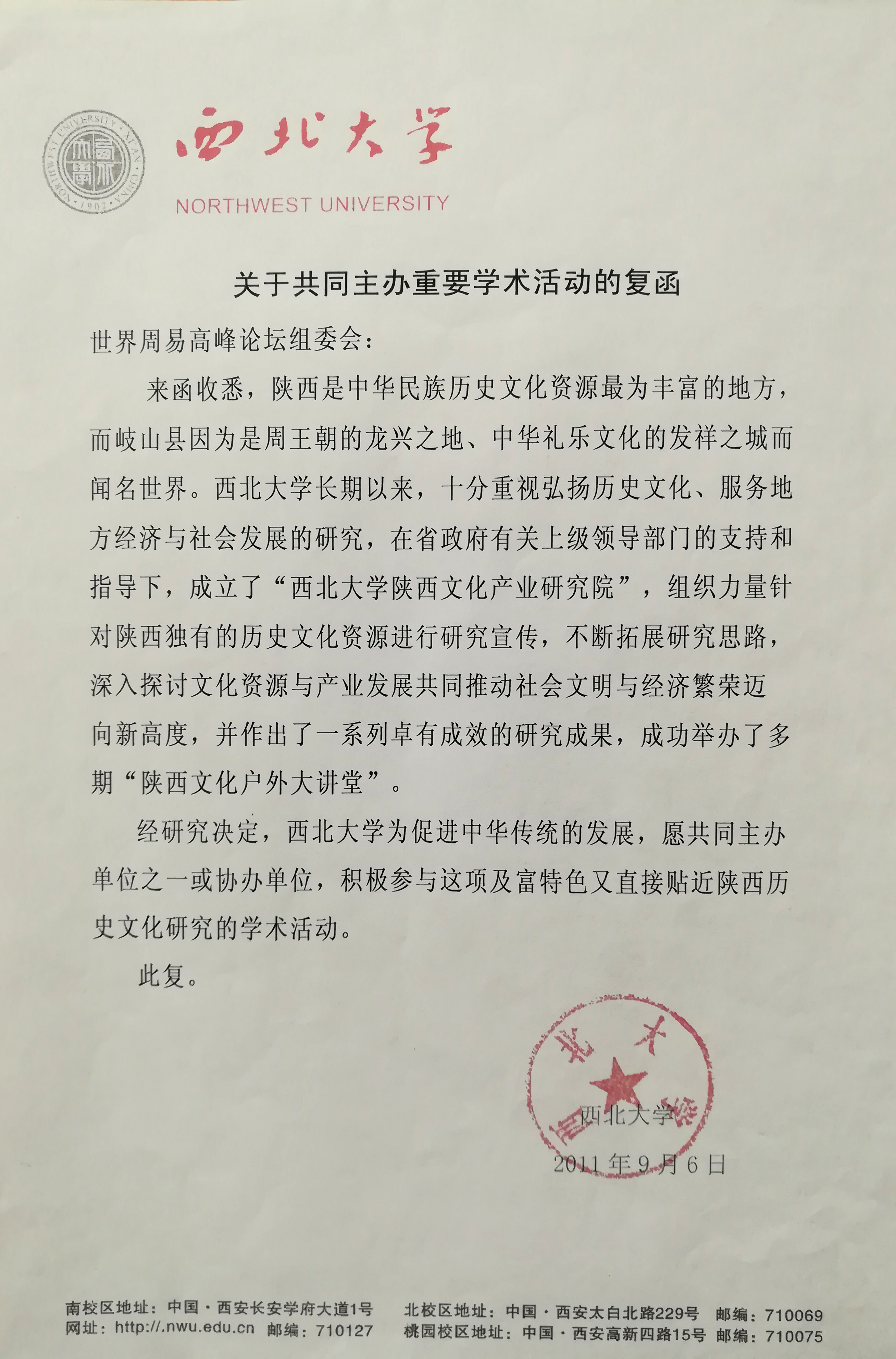 西北大学关于共同主办重要学术活动的复函