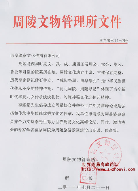 周陵文物管理所申请成为周易协会会员并全力支持李先生筹办世界周易文化高峰论坛