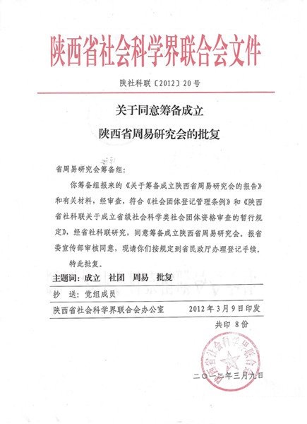 陕西省社会科学界联合会关于同意筹备成立陕西省周易研究会的批复