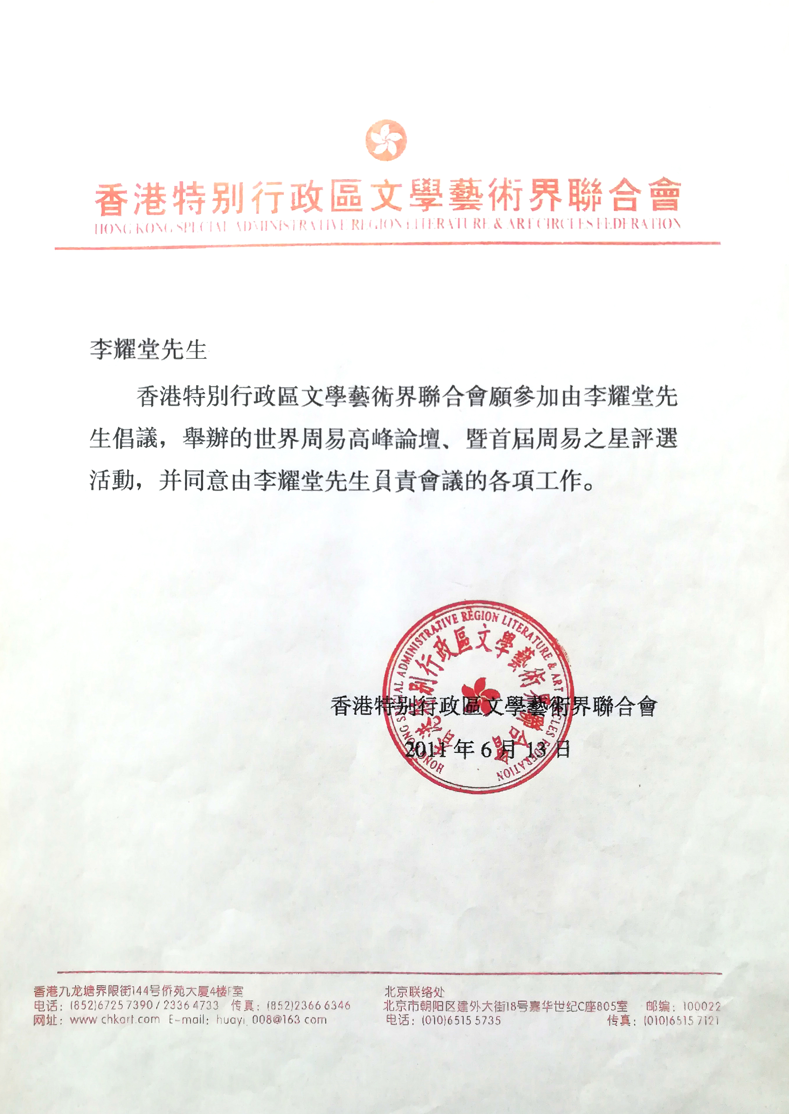 香港特别行政区文学艺术界联合会参加由李耀堂先生倡议,举办的世界周易高峰论坛