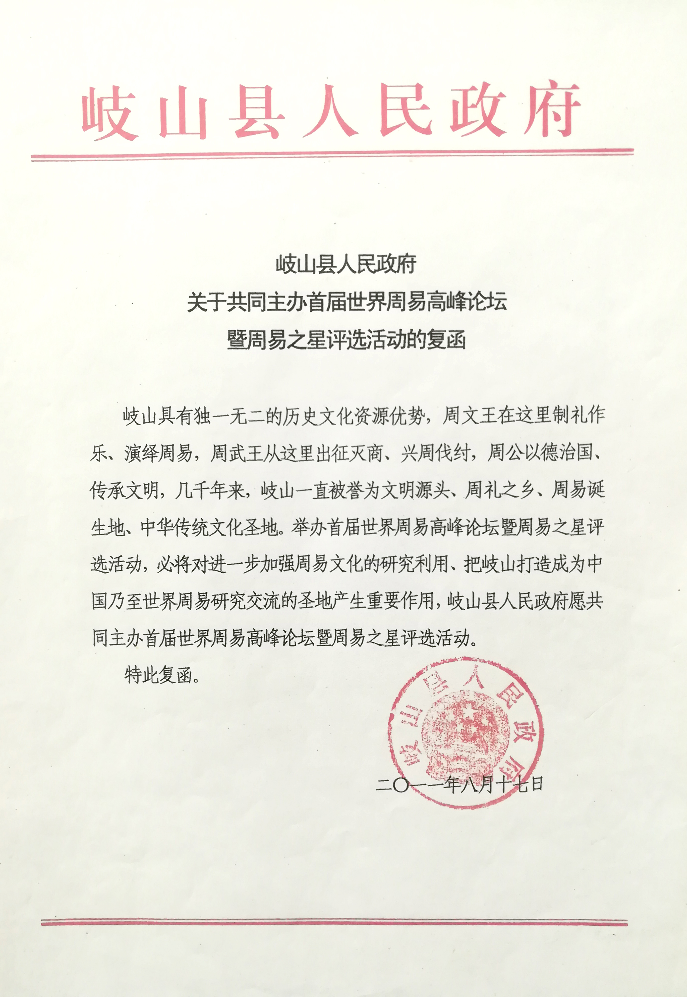 岐山县人民政府关于共同主办首届世界周易高峰论坛暨周易之星评选活动的复函