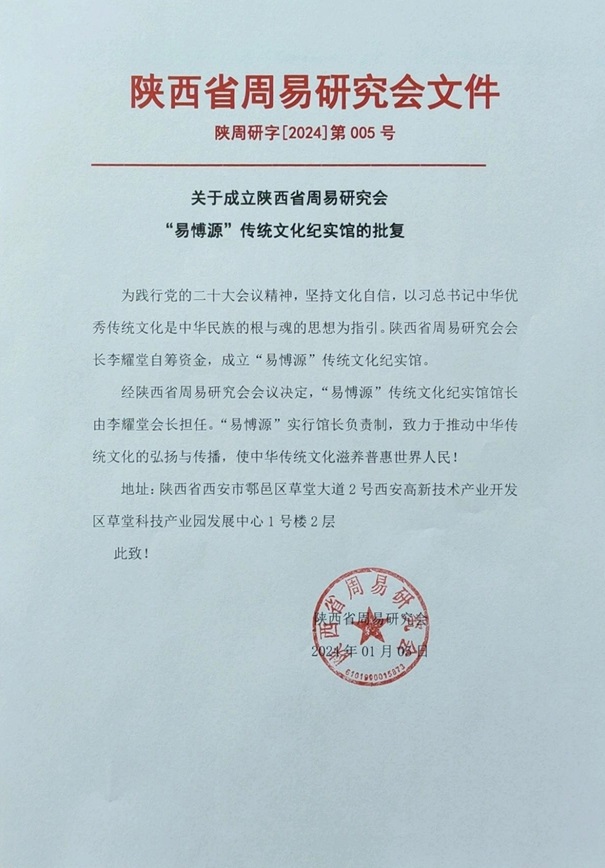 关于成立陕西省周易研究会“易愽源”传统文化纪实馆的批复